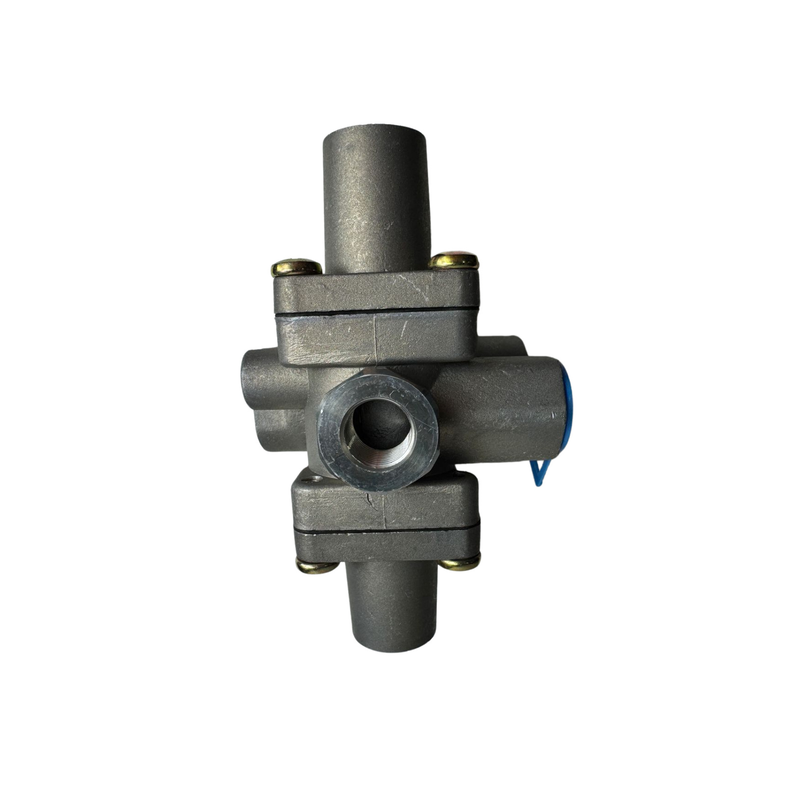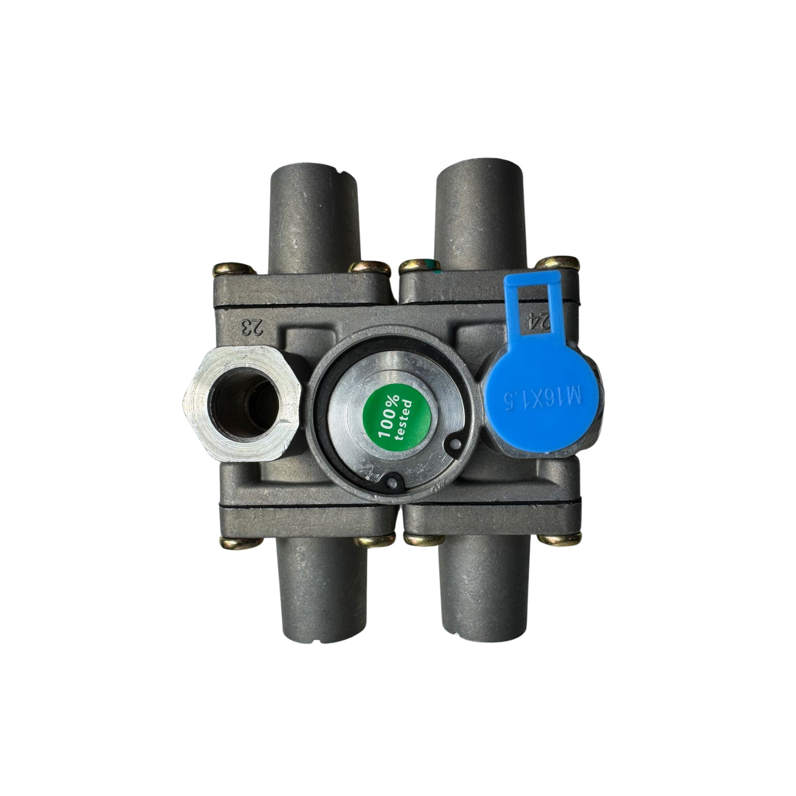 A válvula 4 circuito controla o fluxo de ar comprimido para os freios de diferentes eixos, garantindo equilíbrio na frenagem e prevenindo sobrecarga ou falha do sistema.