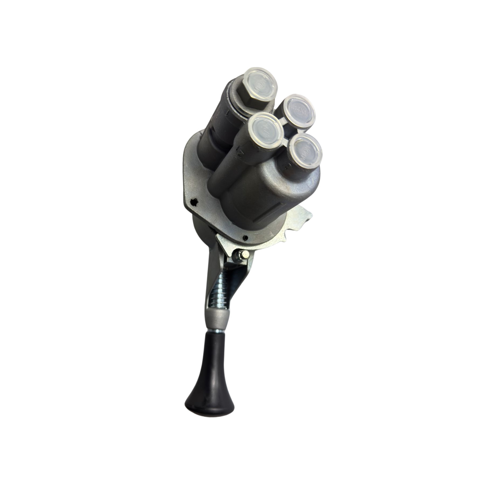 A manete de freio atua no comando manual do sistema de freio pneumático, permitindo ao operador controlar a aplicação e liberação do freio por meio da modulação da pressão de ar.